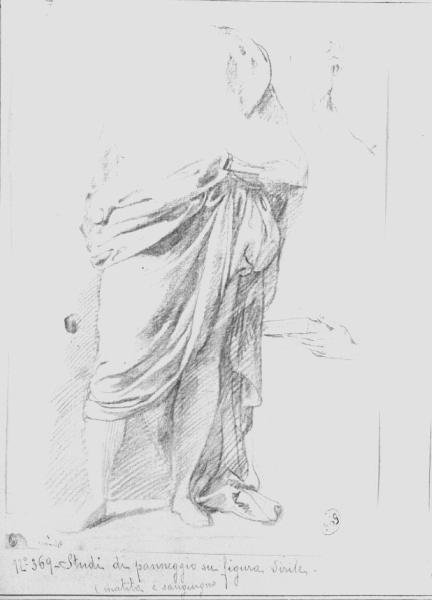 - NOTIZIE STORICO CRITICHE Il disegno è lo studio del panneggio di uno dei filosofi raffigurati nel sipario del Teatro Patriottico (poi dei Filodrammatici) rappresentante la "Virtù che fuga il Vizio" eseguito da Appiani nel 1798. Per questo gruppo l'autore si rifece direttamente alla "Scuola di Atene" di Raffaello. La scelta iconografica attinge al repertorio simbolico del periodo della Repubblica Cisalpina.\n\nAl recto, da verificare. Non sembra corrispondere.\nAl verso, studio di figura con braccia incrociate sul petto.