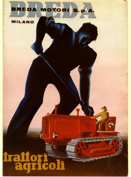 Bozzetto per campagna pubblicitaria dei trattori agricoli della Società Breda. sagoma di uomo in piedi nell'atto di scavare con una pala, mezzi agricoli, sagoma di cavallino rampante, iscrizioni