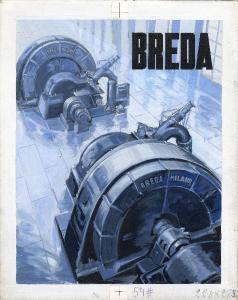 Bozzetto di interno di centrale idroelettrica per campagna pubblicitaria della Società Breda. interno di centrale idroelettrica, iscrizione