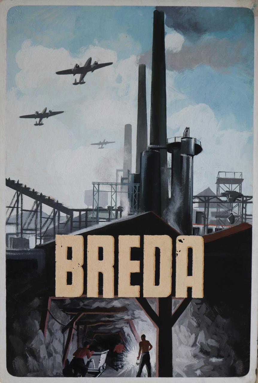 Bozzetto per campagna pubblicitaria della Società Breda. operai al lavoro in una miniera sovrastata da ciminiere e strutture metalliche, aerei, iscrizione