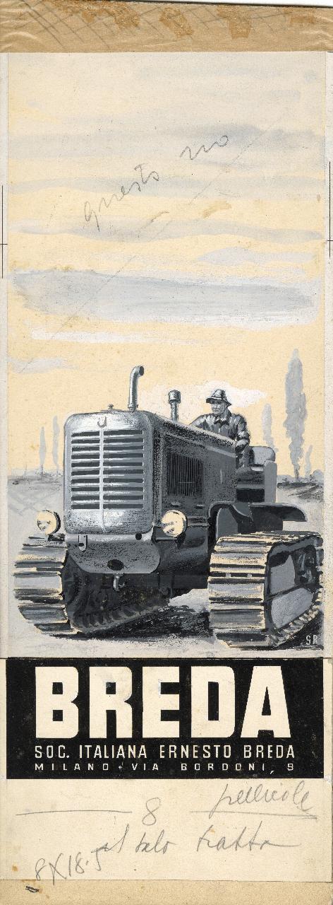 Bozzetto di trattore agricolo per campagna pubblicitaria della Società Breda. trattore agricolo, iscrizioni