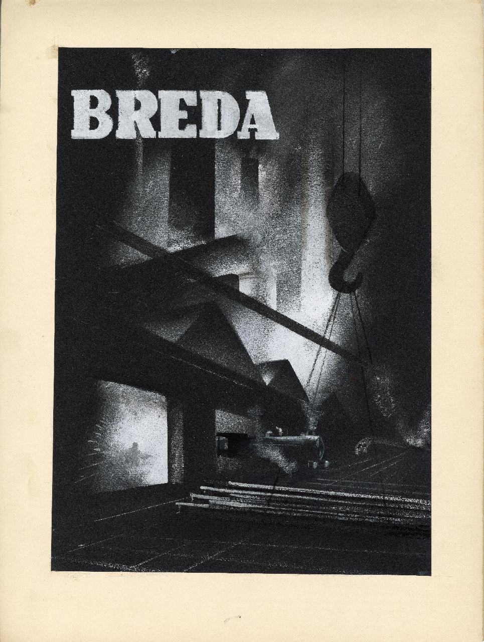 Bozzetto per campagna pubblicitaria della Società Breda. interno di acciaieria, gancio con laminati, treni, ciminiere, iscrizione