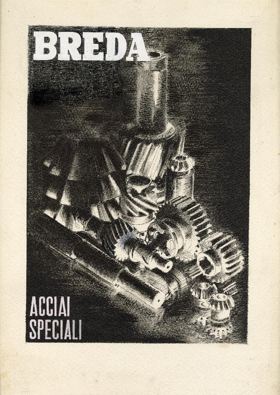 Bozzetto di acciai speciali per campagna pubblicitaria della Società Breda. composizione di acciai lavorati