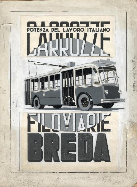 Layout di annuncio pubblicitario per vettura filoviaria della Società Breda. filobus, iscrizioni