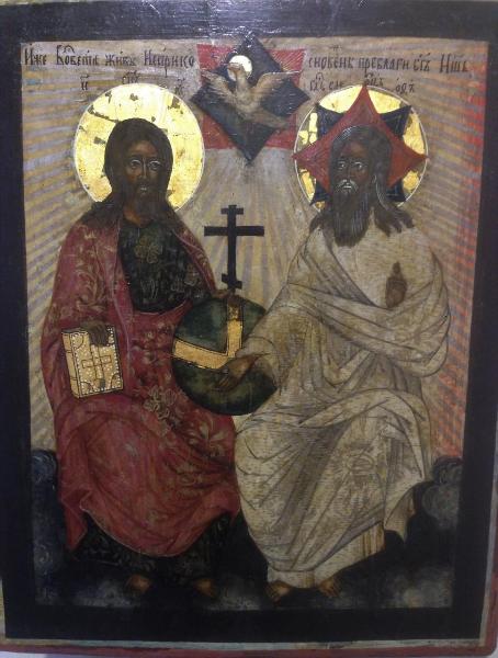 Icona russa raffigurante Padre e Figlio che appoggiano la mano sul globo, con croce russa, posto al centro dell'opera.