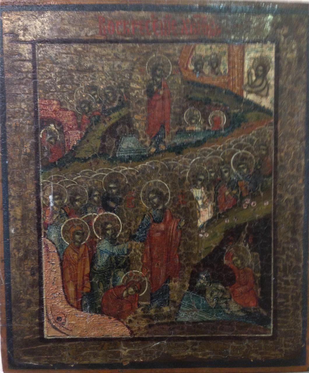 Icona russa raffigurante Cristo, in basso, che discende agli inferi e accompagna, prendendoli per mano, Adamo ed Eva e gli altri in Paradiso. In alto a destra il buon ladrone che sta per entrare in Paradiso perché appena salvato; al centro il Risorto in una mandorla luminosa.