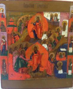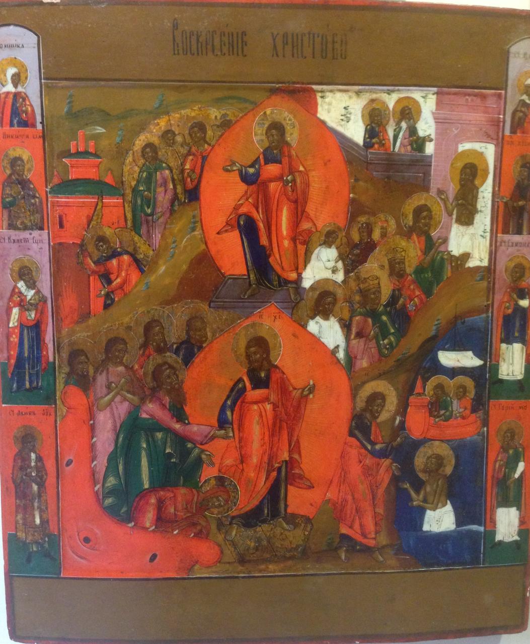 Icona russa raffigurante Cristo, in basso, che discende agli inferi e accompagna prendendoli per mano Adamo ed Eva e gli altri in Paradiso. In alto a destra il buon ladrone che sta per entrare in Paradiso, perché appena salvato; al centro il Risorto in una mandorla luminosa. Ai lati, sulla bordura, sono raffigurati i santi protettori della famiglia del committente e precisamente, sulla sinistra, dall'alto in basso: Domenica, Nikita, Biagio, Aviv; a destra: Maria, Xenia, Simone, Gorin.