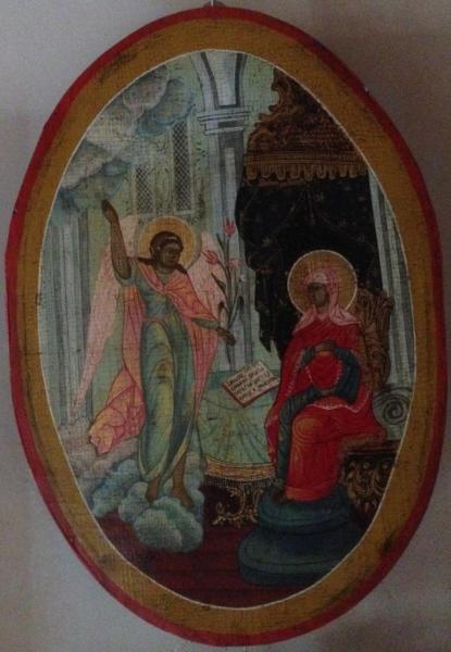 Icona russa raffigurante l'Arcangelo Gabriele mentre appare a Maria per portarle il lieto annuncio, offrendole un giglio, in un interno riccamente addobbato nella casa di Gioacchino. Si tratta di una tavola ovale proveniente da una delle porte del paradiso nell'iconostasi russa.