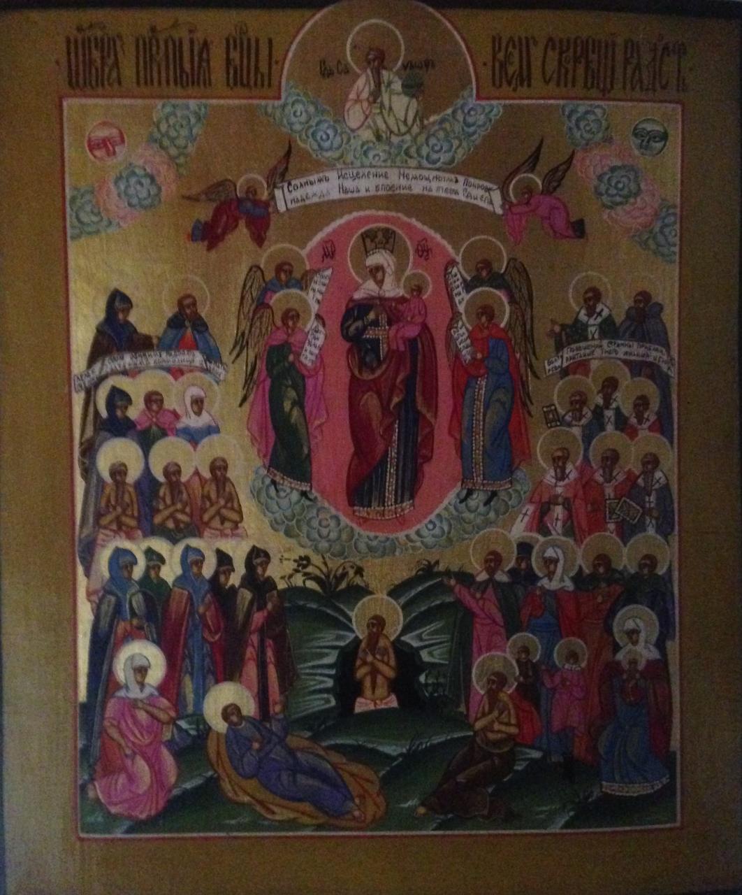 Icona russa raffigurante tutti gli afflitti che si rivolgono in preghiera alla Madre di Dio, ritratta in una mandorla di luce e chiedono la sua intercessione. In alto, al centro, Dio Padre, padrone del mondo. Agli angoli in alto, il sole e la luna simboli dell'evolversi del tempo in cui Dio è padrone.