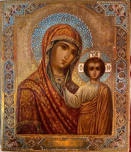 - NOTIZIE STORICO CRITICHE L'icona della Vergine di Kazan' è forse la più diffusa fra le immagini mariane russe. \nCome narrano le fonti, quest'immagine sacra apparve prodigiosamente attorno all'anno 1580 nella città di Kazan' (da cui prese appunto il nome), da poco convertita all'ortodossia dopo essere stata la roccaforte dei tatari, manifestandosi a una fanciulla e indicandole dove scavare per riportarla alla luce: "E quando ebbero scavato alla profondità di poco più di due braccia - oh prodigio! - apparve la miracolosa icona della nostra Signora, la Vergine Maria, la Sua venerata Odigitria, con il Bambino sempiterno, il Signore e Dio Gesù Cristo; sulla meravigliosa icona v'era una logora manica di un abito di panno color ciliegia; e l'icona miracolosamente splendeva di luce meravigliosa, come se fosse appena stata ridipinta, poiché la polvere di questa terra non l'aveva nemmeno sfiorata, come noi stessi abbiamo visto".\nFino al 1612 il culto della Madonna di Kazan' rimase circoscritto alla regione di origine, ma ben presto l'icona si circondò della fama di altri miracoli, che la videro protagonista di avvenimenti di portata nazionale, la cacciata degli invasori polacchi dal suolo nazionale.\nNel 1811, a Pietroburgo, le fu consacrata la cattedrale di Kazan', dove l'icona era custodita come il più prezioso tesoro sacro della capitale. \nNella tipologia iconografica della Madre di Dio di Kazan' si condensano elementi dei due moduli mariani maggiormente diffusi e consacrati dalla tradizione: l'Odigitria, che si fa guida dell'umanità presso il Figlio Divino, e la Eleousa che, nel Figlio - vero Dio e vero Uomo - si china maternamente sull'intero genere umano. \nLa Madre di Dio di Kazan' presenta infatti una variante particolare del tipo canonico dell'Odigitria, da cui si differenzia in molti dettagli: Cristo è raffigurato in piedi, con la mano destra benedicente mentre la sinistra è nascosta sotto le pieghe dell'abito; la Madre di Dio è ritratta fino alle spalle, di modo che le mani restano invisibili, e reclina lievemente il capo verso il Bambino, con un atteggiamento che la avvicina al tipo iconografico della Tenerezza. Al contrario, la postura eretta del Cristo suggerisce un senso di solennità e di saggezza che ricorda per molti aspetti il tipo del Salvatore Emmanuele. Pur nelle dimensioni infantili, infatti, il Cristo è raffigurato come il Maestro, il Dio-Uomo. \nL'accento principale qui è posto sui volti, che sembrano riportati in primo piano e ravvicinati agli oranti: proprio le dimensioni relativamente grandi dei volti, infatti, fanno della tipologia della Madre di Dio di Kazan una delle icone più frequentemente destinate alla preghiera personale. \nLa Madre di Dio di Kazan' era venerata come patrona del focolare domestico, veniva generalmente donata agli sposi durante la cerimonia delle nozze ed entrava davanti a loro nella casa, dove aveva sempre un posto d'onore.\n