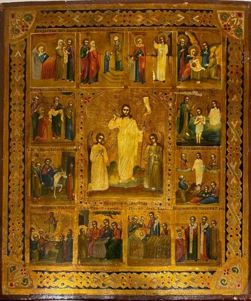 Icona russa composta da dodici riquadri esterni, ognuno raffigurante una delle dodici grandi feste dell'anno liturgico della Chiesa Ortodossa. I dodici riquadri sono disposti attorno alla scena centrale della Risurrezione di Cristo, la Pasqua. Dall'angolo in alto a sinistra si leggono le seguenti feste: primo registro Nascita della Madre di Dio, Presentazione al tempio della Madre di Dio, Annunciazione, Natale; secondo registro da sinistra: Presentazione di Gesù al tempio, Battesimo; terzo registro: Entrata in Gerusalemme, Trasfigurazione; quarto registro in basso: Ascensione, Trinità del Vecchio Testamento, Dormizione della Madre di Dio, Esaltazione della Croce.