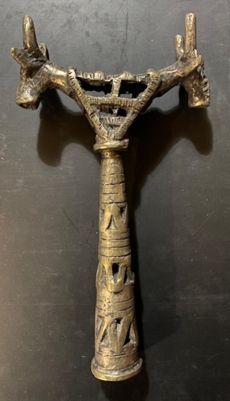 Parte superiore di bastone Pastorale liturgico dei preti Copti. Alle estremità due teste a tutto tondo di bovino con grandi corna. I due anelli in basso sul cono di innesto del bastone, servono per appendere il drappo di stoffa che ricorda quello indossato da Cristo durante la sua Crocifissione.
