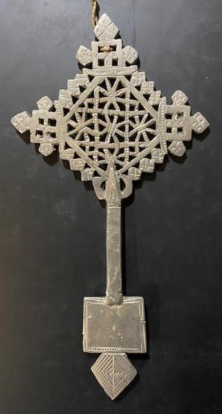 Croce etiope da benedizione a due facce. La parte superiore è formata da un quadrato romboidale a reticolo intrecciato che rappresenta la vita eterna; la parte inferiore termina con un quadrato posto in modo ortogonale, intagliato con decorazione diversa sulle due facce e un piccolo rombo rigato.