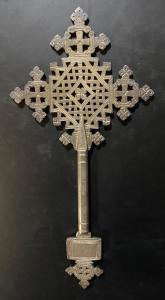 Croce etiope da benedizione a due facce. La parte superiore è formata da un quadrato romboidale a reticolo intrecciato che rappresenta la vita eterna; la parte inferiore termina con un quadrato posto in modo ortogonale, intagliato con decorazione diversa sulle due facce e un piccolo quadrato a tre a quadrifoglio.