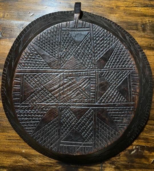 Vassoio tondo intagliato a mano e dipinto con San Giorgio a cavallo al centro e tre angeli sul bordo di rilevo. L'immagine mostra il cavaliere uccidere il drago con la spada e salvare Silene, figlia del re di Salem, destinata al sacrificio. L'interno del vassoio è dipinto a tempera, la parte esterna invece è intagliata a figure geometriche con braccetto per appendere.