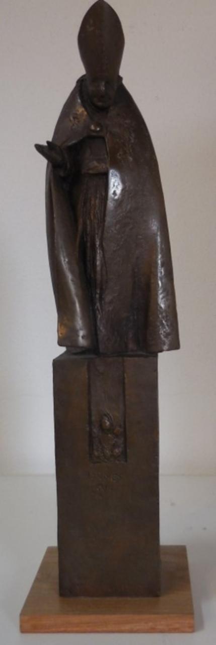 Bozzetto vincitore del concorso (1988) al quale parteciparono ventotto scultori bergamaschi per la realizzazione del monumento da collocare nella Cattedrale di Bergamo, a ricordo di Papa Roncalli. Lo studio per la scultura bronzea, inaugurata nel 1989, percorre la via per saper tradurre la monumentalità anche grazie al piviale e alla mitria realizzata con armonia poetica e sintesi plastica. L’opera si distingue per la compattezza e l’equilibrio.\nNella ricorrenza del 30° anniversario dell’elezione di Giovanni XXIII al soglio pontificio e a 25 anni dalla sua morte, il Capitolo della Cattedrale propose un concorso per predisporre a ricordo una scultura monumentale bronzea.\n\n