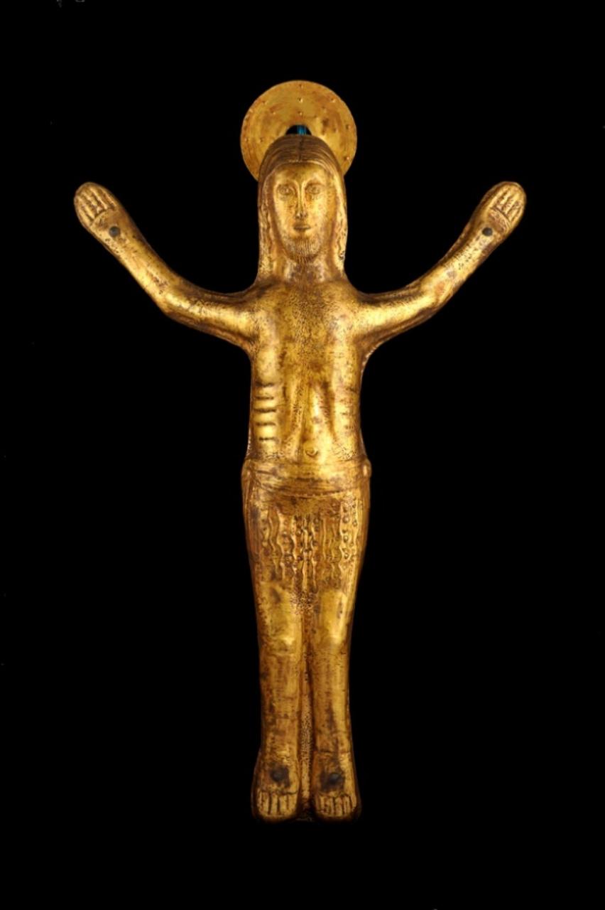 Nella seconda parte degli anni '60 del XX secolo, la Parrocchia si S. Maria Assunta e S. Giacomo Apostolo di Romano di Lombardia, commissionarono allo scultore questo Crocifisso. Il Cristo appare senza croce, con le braccia allargate, completamente dorato che lo colloca in una dimensione metafisica. L'anatomia nell'insieme non è dettagliata ma sintetizzata e deformata per ottenere una lettura soprattutto simbolica. Sono degni di nota: il volto in una posa ieratica e il perizoma piuttosto elaborato.\nL'opera si presenta come un rilievo ma senza fondo.\n