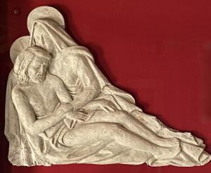 Molte volte lo scultore ha affrontato il tema cosiddetto della "Pietà" sia come idea personale da svolgere, sia perché sollecitato dalle frequenti richieste della committenza per le tombe dei propri cari. Locati presenta Maria che trattiene sulle ginocchia il Figlio morto più con la forza dell'amore confermato dal bacio senza fine della Madre sul capo di Gesù che con la forza fisica.\nI bordi del rilievo sono volutamente non riquadrati forse perché si tratta di un modello in gesso per una formella bronzea da applicare a un portale o sulla lapide di una tomba.