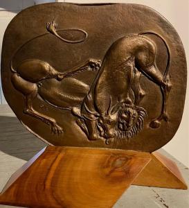 L’artista particolarmente noto per le sue figure animali che costituiscono un repertorio estetico e simbolico straordinario, raffigura nel bronzo un leone disperato che è sopraffatto dall’antilope. Il segno grafico nervoso e incisivo, studiato nella plasticità, conferisce all’immagine un forte senso di tragicità. Nel combattimento il predatore soccombe inaspettatamente.\n