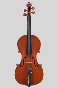 Strumento costruito mediante una forma esterna, secondo il metodo costruttivo appreso dal suo maestro Cesare Candi (1869-1947). La presenza di controfasce passanti sopra i tasselli delle punte è tipica della prassi costruttiva della scuola genovese. Il fondo e la tavola armonica sono costituiti da un unico pezzo. Le punte della tavola e del fondo sono di piccole dimensioni, ben lavorate e conferiscono un aspetto elegante allo strumento. Il filetto è posizionato piuttosto all'interno rispetto al bordo e la sguscia appare abbastanza larga. Lo sviluppo della chiocciola presenta nella vista frontale un primo giro molto sporgente con l'occhio quasi nascosto e lo smusso largo e piatto. Il ponticello non è originale.