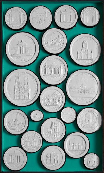 Cassetta di legno di faggio, foderata con carta verde contenente diversi stampi in scagliola da gemme incise riproducenti opere d'arte celebri di Roma, Firenze, Milano, Parigi, Napoli e in alcune importanti collezioni private.