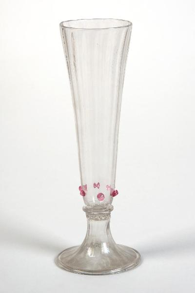 Flute da spumante con coppa stretta, allungata a imbuto. La struttura, in vetro trasparente, è troncoconica, modellata da sinuose scannellature ed è decorata con perline rosa alla base della flute.