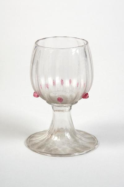Piccolo calice da liquore con coppa profonda, svasata alla base. La struttura, in vetro trasparente, è modellata da sinuose scannellature ed è decorata con perline rosa alla base della calice.