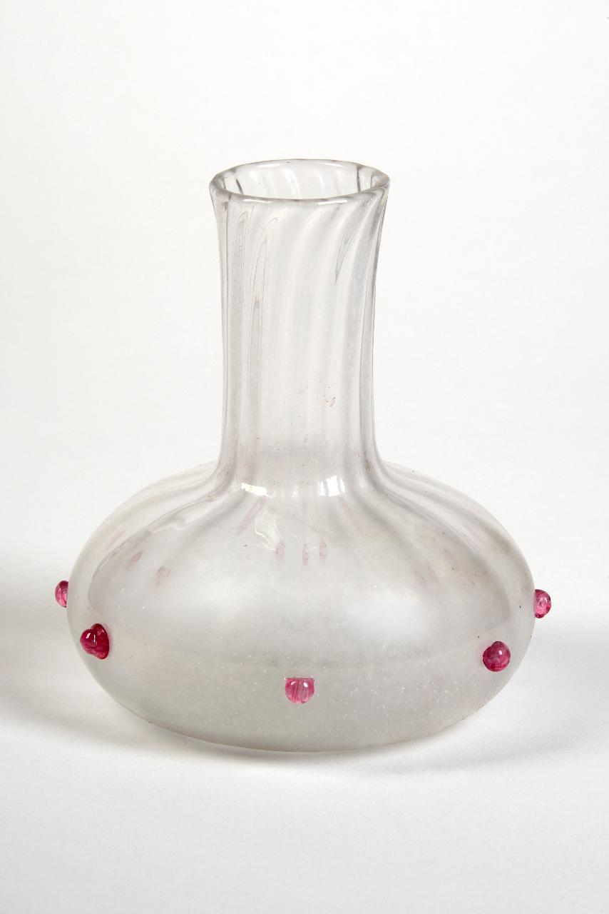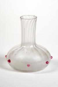 Decanter con collo corto e stretto, pancia bassa e svasata. La struttura è troncoconica, modellata da sinuose scannellature ed è decorata con perline rosa lungo la pancia.
