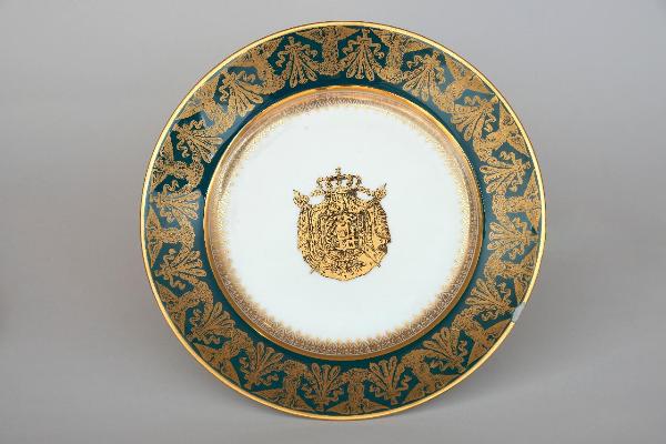 Piatto piano circolare in porcellana con tesa ornata da motivi in oro su uno sfondo verde scuro. Al centro del piatto uno stemma araldico, sempre in oro circondato da un motivo geometrico dorato che decora anche il bordo interno del piatto.