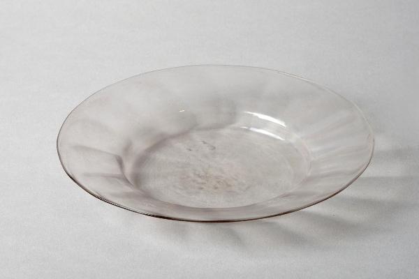 Piattino da frutta circolare in vetro trasparente con tesa ondulata.