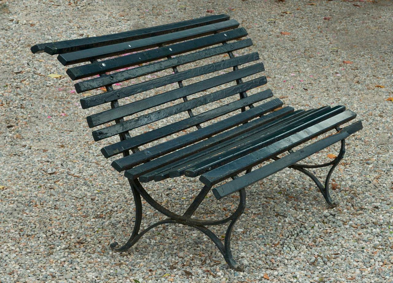 Seduta da esterno costituita da una struttura in ferro battuto con le gambe ricurve, collegate da due sostegni, dipinte di verde. La seduta e lo schienale sono costituiti da listelli di legno verniciati di verde posti in sequenza seconda un'inclinazione morbida e sinuosa.
