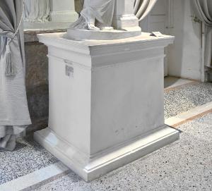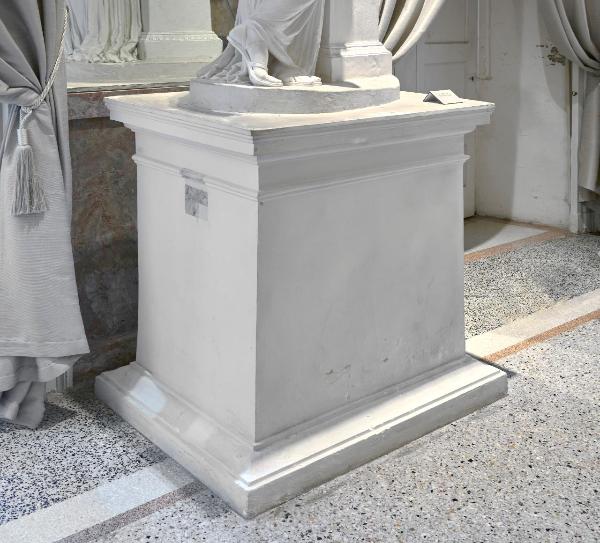Basamento cavo di forma parallelepipeda, con struttura in muratura. Superfici rifinite a finto marmo e successivamente imbiancate. La base e la terminazione modanate sono in stucco.