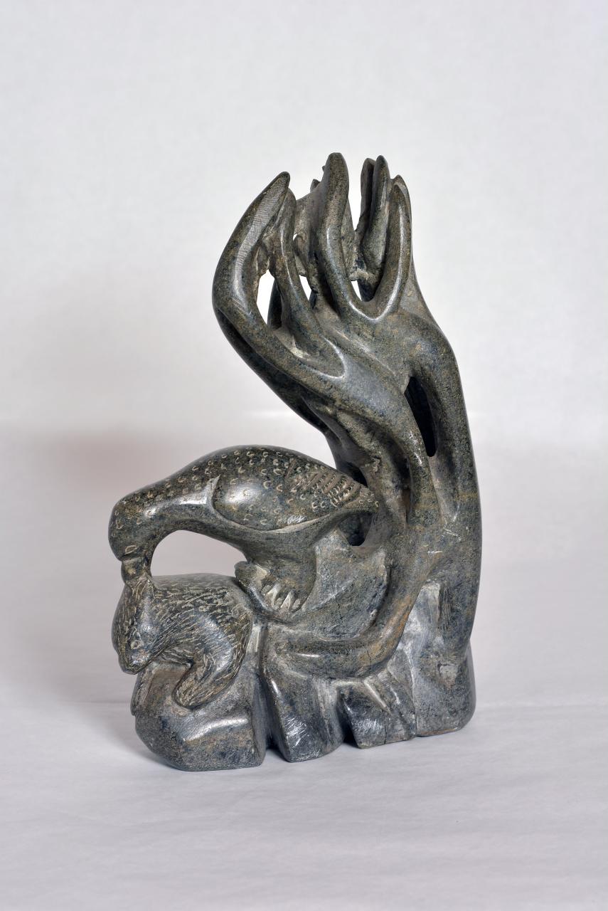 Scultura rappresentante un uccello artico che cattura un orso, posato sugli scogli con rappresentati spruzzi delle onde stilizzati.\nCome da descrizione in elenco.