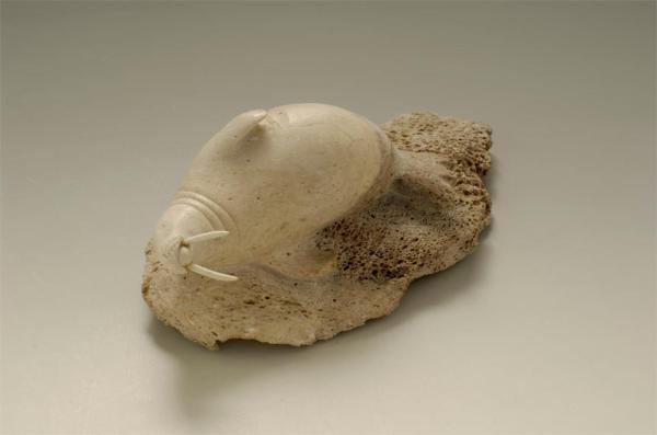 Scultura che raffigura un tricheco disteso sulla banchisa.\nCome da descrizione in elenco.