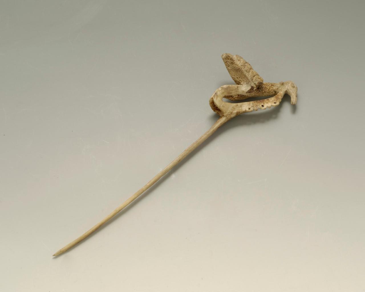 Spillone in osso di balena, con scolpito un uccello che spicca il volo.\nCome da descrizione in elenco.