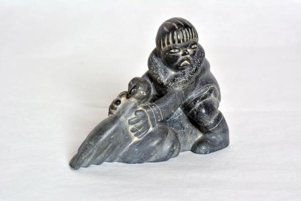 Statua raffigurante un uomo inuit mentre cattura due uccelli artici.\nCome da descrizione in elenco.