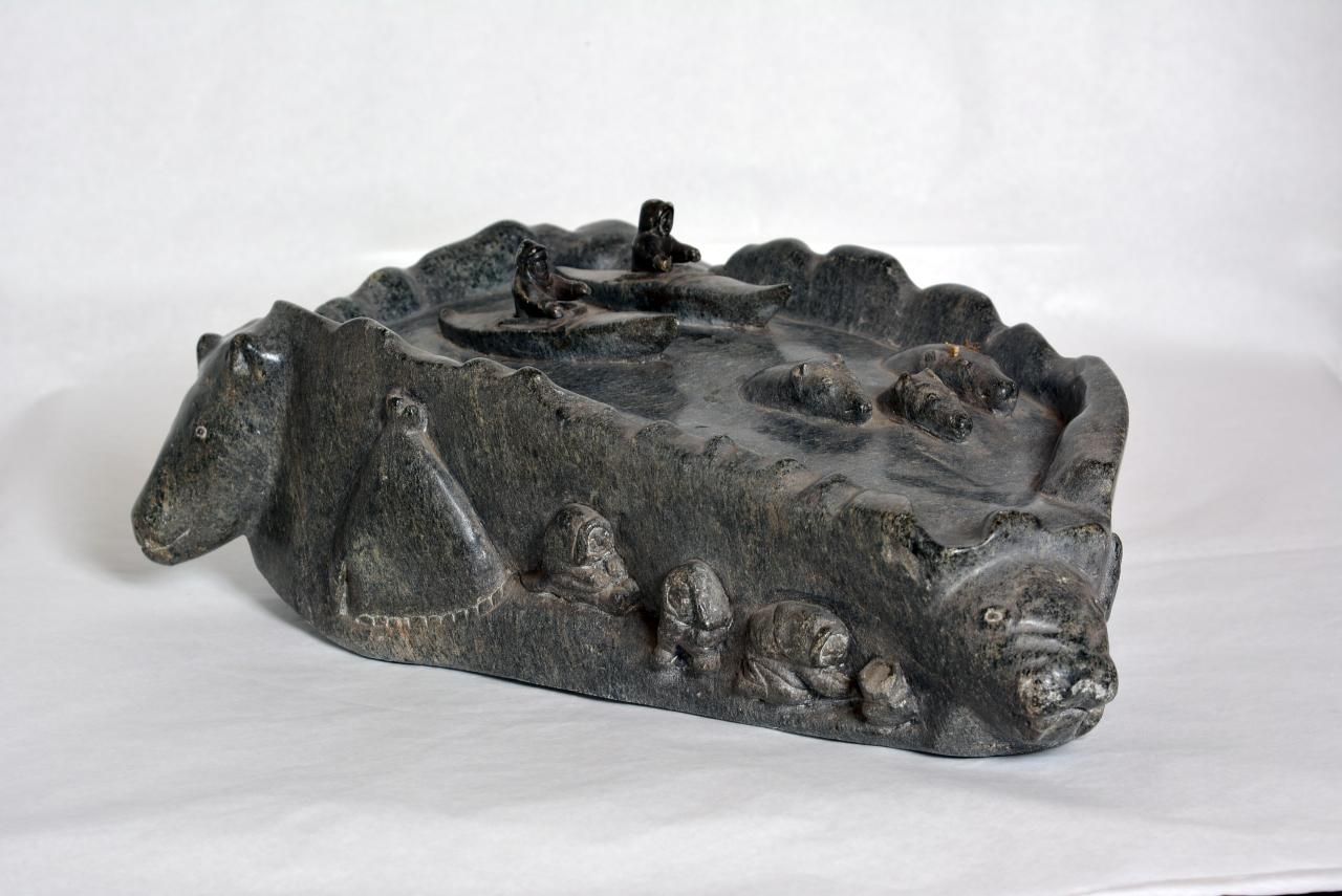 Su una piattaforma sono presenti due inuit su un qayaq mentra cacciano il caribù in acqua. Scolpiti sui tre lati ci sono le donne del villaggio, uomini in slitta e tre inuit su un qayaq.\nCome da descrizione in elenco.