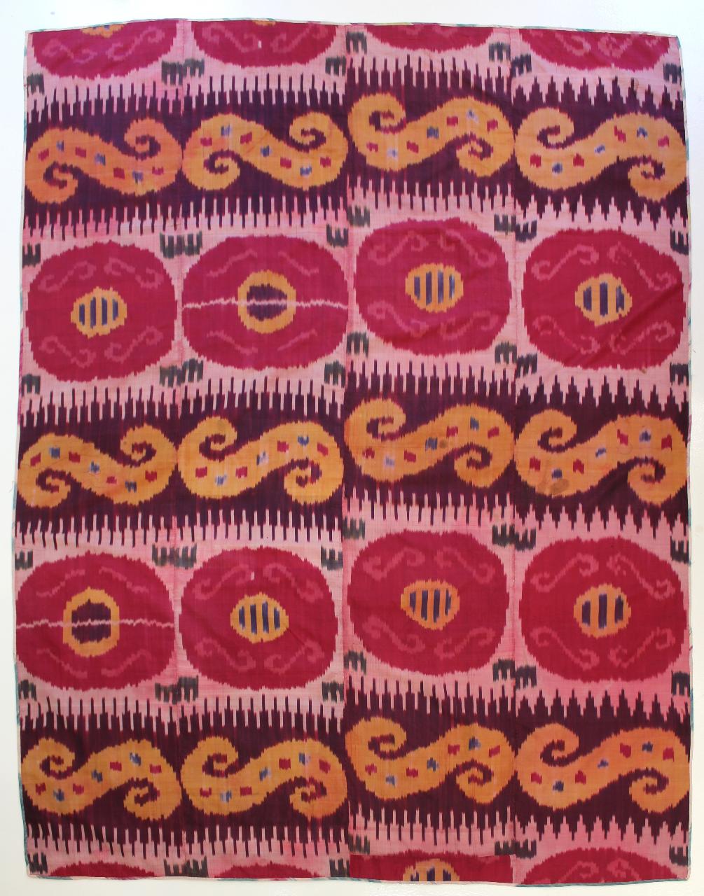 - NOTIZIE STORICO CRITICHE L'ikat è una tecnica di produzione tessile in cui il disegno viene creato prima della tessitura attraverso il processo di tintura dei filati. Nella tecnica di tintura ikat i fili vengono raggruppati e legati in lunghi fasci che costituiscono l'ordito del tessuto. Seguendo il pattern scelto, questi fasci vengono coperti in alcune zone per resistere alla penetrazione del colorante e permettere alle aree scoperte di assorbire il colore. Una volta tiniti, i fili vengono intessuti con la trama tramite il telaio, dando vita al tessuto vero e proprio. La caratteristica dei tessuti ikat è un'apparente "sfocatura" del design. La sfocatura è il risultato dell'estrema difficoltà che il tessitore incontra nell'allineare i fili tinti in modo che il disegno sia perfettamente leggibile sul tessuto finito. Gli ikat con poca sfocatura, più colori e motivi complicati sono più difficili da creare e quindi sono spesso più pregiati e costosi. I motivi tipici dei tessuti ikat, molto stilizzati e astratti, traggono ispirazione da soggetti presi dalla natura, come uccelli, scorpioni, fiori, alberi. \nI primi tessuti tinti con la tecnica ikat sono attribuiti agli artigiani dell'antica città di Bukhara (Uzbekistan), immersa in una delle fertili oasi dell'Asia centrale. La prima produzione commerciale su vasta scala di ikat iniziò probabilmente qui alla fine del XVIII secolo e si diffuse a nord-est fino a Samarcanda e Tashkent entro la metà del XIX secolo. Il termine tradizionale per la tecnica ikat in Asia centrale è “abrbandi”, che si traduce in "legare le nuvole" (abr, nuvola; bandi, legare). Il termine più diffuso “ikat” deriva invece dalla parola malese mengikat , che significa appunto "legare" per via delle modalià di tintura.\nQuesto esemplare è stato acquistato da Mila Bertinetti e dal marito Franco Maria Montevecchi in Uzbekistan.\n