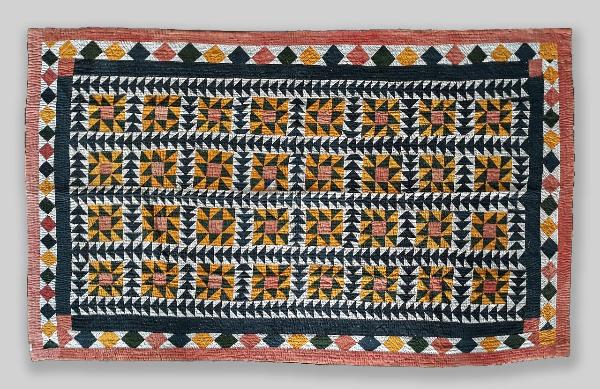 Drappo costituito da bordo con tre fasce concentriche di vari colori e da una parte centrale lavorata a patchwork con decorazione a blocchi quadrati con motivi a triangolo disposti in varie direzioni. Il bordo (putti) è costituito da tre bordi concentrici di diversi colori e decorazione: bordo rosso/arancione (5 cm); bordo bianco (6 cm) con patchwork di rombi, in colore nero, rosso/arancione, verde, giallo e triangoli bianchi; bordo nero (6 cm). La parte centrale (baro) è costituita da una decorazione a patchwork di triangoli neri e mezzi triangoli bianchi che formano delle bande longitudinali e orizzontali che incrociandosi creano dei blocchi quadrati: quattro in ampiezza e otto in lunghezza. Questi “quadrati” sono costituiti a loro volta da patchwork di triangoli gialli e verdi e da un quadrato centrale rosso/arancione. Nei blocchi quadrati la direzione dei triangoli è casuale. Interessante su questo drappo è il motivo del triangolo. Nelle culture tradizionali dell’Asia Centrale il triangolo simboleggia protezione, prosperità e buon auspicio. I triangoli di vecchia stoffa cuciti su tuniche o assemblati a patchwork sono anche un simbolo di povertà e rinuncia ai beni terreni nel sufismo. (Studio di Paola Manfredi)\n