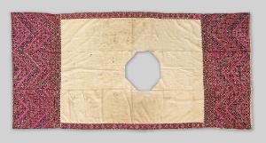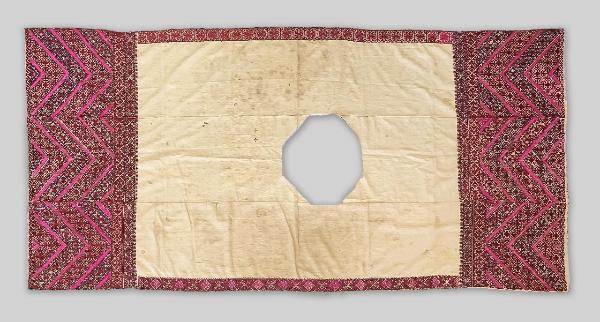 Scialle di cotone (kaddar) tessuto a mano, con trama regolare. Costituito da tre teli cuciti a mano (38 x 255 cm cad.). Ricamo importante alle due estremità alto 50 cm, con motivo a zig zag in cui si alternano i colori fucsia, rosso e bordeaux. Il ricamo “centrale” (in realtà è decentrato e non posizionato al centro dello scialle) ottagonale tipico di questo tipo di scialli manca perché è stato asportato e c’è quindi un buco.\nI due bordi longitudinali sono alti 6 cm ed hanno motivi diversi l’uno dall’altro. \n(Studio di Paola Manfredi)\n