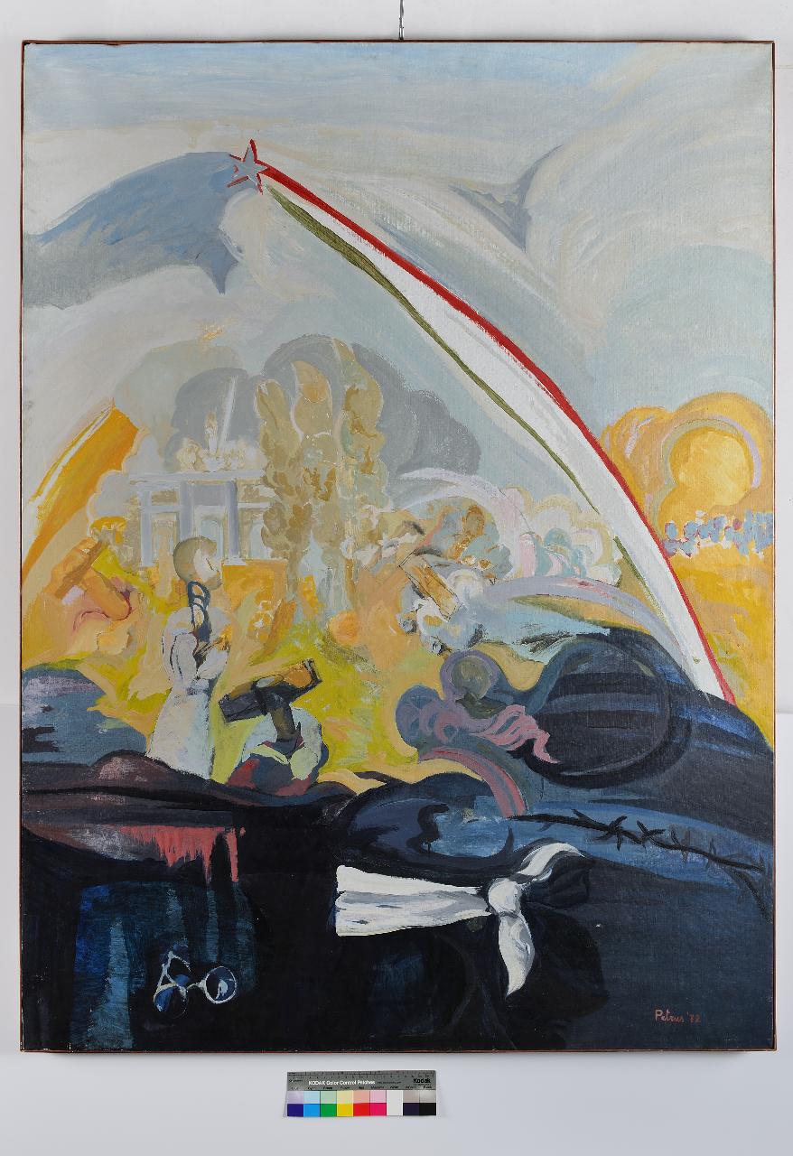 - NOTIZIE STORICO CRITICHE L'opera proviene da una precisa vicenda storica della quale ANPI fu protagonista. Dall'8 al 30 giugno 1974 venne aperta, nella Sala della Balla al Castello Sforzesco di Milano, una grande mostra nazionale che riuniva un imponente numero di opere d'arte, divise in una sezione storica e in una parte riservata ad artisti della piena contemporaneità. Lo scopo dell'esposizione, che si intitolava "Mostra vendita di opere d'arte a favore della Resistenza internazionale", è ben specificato nei documenti che la testimoniano, conservati presso l'archivio della Fondazione ISEC di Sesto San Giovanni. Per la parte di arte contemporanea, le opere erano donate dai loro autori ad ANPI per essere vendute: il ricavato sarebbe stato impiegato a sostegno della "Resistenza internazionale e delle lotte contro ogni forma di fascismo risorgente". \nNella manifestazione del 1974 Vitale Petrus ebbe ruoli precisi nell'organizzazione, come dimostra il suo nome segnato tra i componenti della Commissione Esperti, composta da dodici persone, tra le quali risultano presenti anche Mario De Micheli, Ernesto Treccani e Giorgio Seveso.\nIl nome dell'autore è presente nel catalogo dell'esposizione, mentre l'opera è precisamente segnata nei documenti ISEC in questi termini: n° 94 N° Blocch. 213 Autore PETRUS VITALE Via F. Chiari, 16 - Milano Titolo 25 APRILE Tecnica 1972 Misura 100 x 135 Valore 250.00 ( Archivio della Fondazione ISEC di Sesto San Giovanni, fondo ANPI provinciale di Milano, busta 33, fascicolo 245, Polizza Compagnia Assicurazione Unipol, Mostre e Manifestazioni d'arte, n° 2548 Bologna sede). \nIl titolo dell'olio, 25 aprile, appare chiaramente suggerito dal tema centrale dell'esposizione del 1974: l'opera ben testimonia la ricerca dell'autore, caratterizzata da una attenzione particolare per un "segno disegnato", sostenuto da un curato e insieme sentito impiego del colore, che concorre alla creazione di immagini nelle quali pathos e humor definiscono racconti di profonda riflessione civile ed esistenziale. \nVitale Petrus nasce a Kiev nel 1934 e studia all'Accademia di Venezia sotto la guida di Bruno Saetti; arrivato a Milano negli anni sessanta, partecipa intensamente alla vita artistica della città, in una carriera espositiva che era iniziata nel 1959 alla Fondazione Bevilacqua La Masa di Venezia e che vede il suo impegno anche nel campo del disegno e dell'incisione; l'artista, che ha esercitato attività di docente al Liceo Artistico di Brera, si è spento a Milano nel 1984. \n