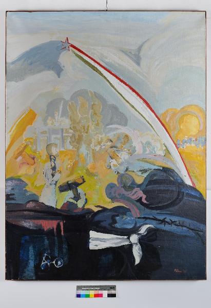 Nella parte bassa del quadro colori scuri lasciano intravedere alcuni particolari, come un paio d'occhiali e un nastro allacciato. La sezione centrale è dominata dai toni di un giallo acceso, che delinea braccia che sollevano falce e martelli su uno sfondo costituito dalla sagoma dell'Arco della Pace di Milano. Lo spazio più alto dell'opera è occupato da un cielo reso in toni di grigio, sul quale appare una stella dalla lunga scia tricolore.