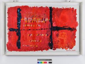 Su un riquadro rosso, dalla forma approssimativamente rettangolare e steso con pennellate visibili, si posizionano segni neri più consistenti e altri, più piccoli, sempre in nero e in giallo, grigio e bianco.