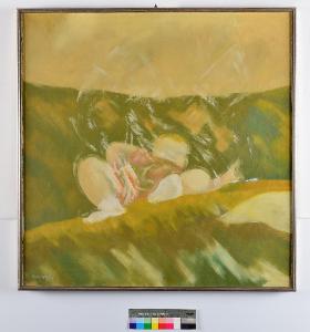 Sullo sfondo costituito da un'altura, oltre la quale è un cielo lattiginoso, appoggiata su un sopralzo, in primo piano è una figura distesa, i cui tratti si perdono in un alone di nebbia avvolgente, evocato con tratti chiari di colore.