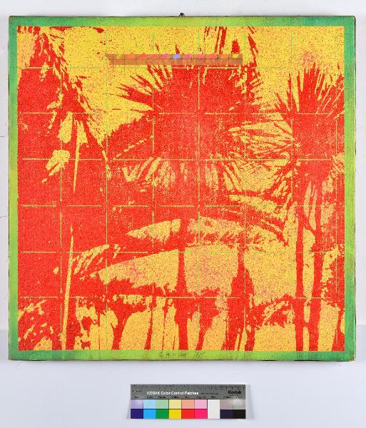 Su uno sfondo giallo si elevano elementi vegetali, eseguiti in rosso, che richiamano la forma delle palme. Una striscia di carta con punti di cromie diverse è posta sulla parte alta del quadro, che è circondato da una cornice dipinta in verde; una griglia di sottili linee verdi, che ricorda la visione di un puntamento militare, si sovrappone completamente all'immagine.