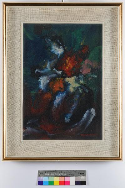 La scena pittorica è integralmente occupata da un mazzo di fiori i cui colori prevalenti sono l'azzurro, il rosso e il bianco.