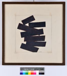 Sul fondo bianco si sovrappongono, in una disposizione che sale verso l'alto, sagome nere di forma rettangolare.