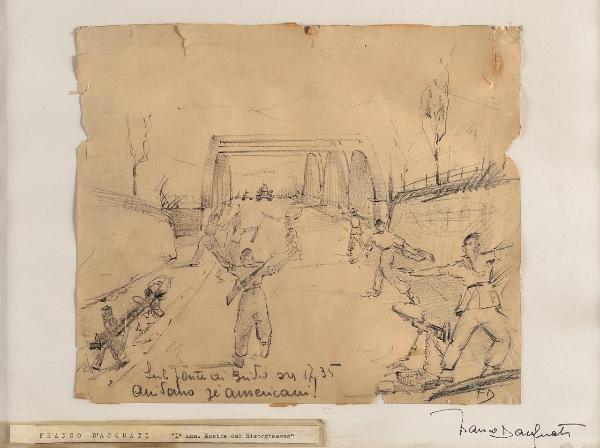 - NOTIZIE STORICO CRITICHE Il disegno è incorniciato insieme a un altro dello stesso autore con tema simile ("Il nostro autocarro brucia sulla strada di Lecco dopo uno scontro con i tedeschi in fuga") e in basso sul passe-partout è presente un'etichetta che riporta FRANCO D'ACQUATI "I° man. Mostra del Risorgimento": questa nota potrebbe indicare che l'opera sia uno degli studi realizzati da Dacquati per il manifesto della "Mostra del 1° e 2° Risorgimento", tenuta a Milano nel 1946, oppure che abbia partecipato alla selezione espositiva della rassegna: sappiamo infatti che Dacquati lavorò per questa manifestazione, come testimoniato da un bozzetto per il manifesto conservato in Casa della Memoria; non si tratta comunque di un'etichetta collocata dall'artista, considerata la scrittura errata del nome (D'Acquati e non Dacquati). Quest'opera, insieme a quella incorniciata nello stesso quadro, appare strettamente collegata ad altri due disegni di Dacquati anch'essi incorniciati insieme e con etichetta simile ("Brivio 27.4.45 ore 16 la colonna Farinacci in vista" e "Dopo l'imboscata di Rovagnate"), sempre conservati in Casa della Memoria. \nLo stato di conservazione del disegno, come degli altri tre a esso collegati, fa immaginare una sua sofferta sopravvivenza in circostanze difficili, forse proprio quelle del 1945, quando potrebbe essere stato eseguito divenendo una significativa e preziosa testimonianza storica.\nUn altro dei cartellini visibili sul retro, quello dentellato coperto da un cartellino successivo, appare perfettamente accomunabile con i cartellini, del tutto simili ma con diversa numerazione, di altre opere della raccolta ANPI: questo rilievo suggerisce che l'opera, insieme alle altre così caratterizzate, potesse aver fatto parte o di un gruppo di lavori archiviati precedentemente con conseguente numerazione o della selezione espositiva di una ulteriore mostra. Su di essa è per ora possibile solo dire che, considerati i contenuti delle opere con questo cartellino, non dovrebbe essersi trattato di una mostra-vendita, ma di una esposizione dedicata specificamente al tema della Resistenza; per quanto concerne la data di questa ipotetica rassegna, è da fissare a dopo il 1960, per la data della tela di Salvatore Blasco con identico cartellino.\nFranco Dacquati nasce a Milano nel 1910, dove studia e si diploma all'Accademia di Brera; tra il 1942 e il 1944 compie reportage d'arte sul fronte di guerra. Tra 1946 e 1952 cura una rubrica sulla rivista "Corriere degli artisti". Il suo percorso espressivo è presentato in diverse mostre personali, mentre partecipa a importanti collettive, come la Biennale di Milano, dove è presente nel 1950 e nel 1958. Ha svolto attività di insegnamento e alcune delle sue opere sono conservate al Museo del Risorgimento di Milano. La sua arte si sviluppa in un ambito di figurazione nel quale ricorrente è il tema della figura, particolarmente femminile: l'opera di proprietà ANPI appartiene a una cospicua serie di lavori dell'artista conservati in Casa della Memoria e dedicati alle tematiche della Resistenza. L'artista è morto a Milano nel 1988. \n