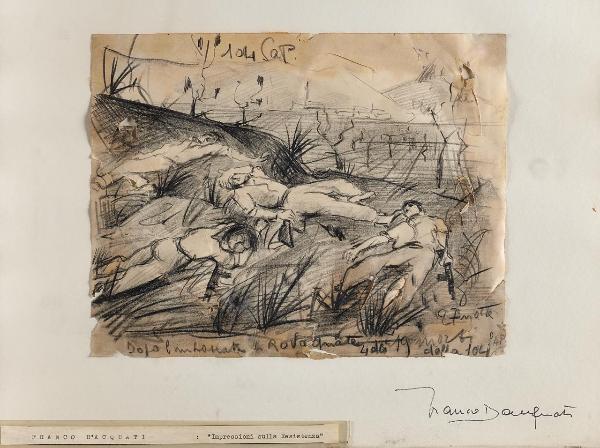 - NOTIZIE STORICO CRITICHE Il disegno è incorniciato insieme a un altro dello stesso autore con tema simile ("Brivio 27.4.45 ore 16 la colonna Farinacci in vista") e in basso sul passe-partout è presente un'etichetta che riporta FRANCO D'ACQUATI "Impressioni sulla Resistenza". Il cartellino è simile a quello presente in un altro quadro, sempre conservato in Casa della Memoria, nel quale sono collocati altri due disegni di Dacquati ("Il nostro autocarro brucia sulla strada di Lecco dopo uno scontro con i tedeschi in fuga" e "Sul ponte di Brivio ore 17,35 arrivano gli americani!") e che sotto riporta su un'etichetta "Mostra del 1° e 2° Risorgimento". Quindi questo disegno, insieme agli altri tre a esso collegati, potrebbe, aver fatto parte della selezione espositiva della rassegna tenuta a Milano nel 1946 ("Mostra del 1° e 2° Risorgimento") oppure essere stato un'idea per un bozzetto per il manifesto dell'esposizione, per il quale Dacquati lavorò, come testimoniato da un bozzetto per manifesto sempre conservato in Casa della Memoria; non si tratta comunque di un'etichetta collocata dall'artista, considerata la scrittura errata del nome (D'Acquati e non Dacquati).\nLo stato di conservazione del disegno, come degli altri tre a esso collegati, fa immaginare una sua sofferta sopravvivenza in circostanze difficili, forse proprio quelle del 1945, quando potrebbe essere stato eseguito divenendo una significativa e preziosa testimonianza storica.\nUn altro dei cartellini visibili sul retro, quello dentellato coperto da un cartellino successivo, appare perfettamente accomunabile con le etichette, del tutto simili ma con diversa numerazione, di altre opere della raccolta ANPI: questo rilievo suggerisce che l'opera, insieme alle altre così caratterizzate, potesse aver fatto parte o di un gruppo di lavori archiviati precedentemente con conseguente numerazione o della selezione espositiva di una ulteriore mostra. Su di essa è per ora possibile solo dire che, considerati i contenuti delle opere con questo cartellino, non dovrebbe essersi trattato di una mostra-vendita ma di una esposizione dedicata specificamente al tema della Resistenza; per quanto concerne la data di questa probabile rassegna, è da fissare a dopo il 1960, per la data della tela di Salvatore Blasco con identico cartellino.\nFranco Dacquati nasce a Milano nel 1910, dove studia e si diploma all'Accademia di Brera; tra il 1942 e il 1944 compie reportage d'arte sul fronte di guerra. Tra 1946 e 1952 cura una rubrica sulla rivista "Corriere degli artisti". Il suo percorso espressivo è presentato in diverse mostre personali, mentre partecipa a importanti collettive, come la Biennale di Milano, dove è presente nel 1950 e nel 1958. Ha svolto attività di insegnamento e alcune delle sue opere sono conservate al Museo del Risorgimento di Milano. La sua arte si sviluppa in un ambito di figurazione nel quale ricorrente è il tema della figura, particolarmente femminile: l'opera di proprietà ANPI appartiene a una cospicua serie di lavori dell'artista conservati in Casa della memoria e dedicati alle tematiche della Resistenza. L'artista è morto a Milano nel 1988\n