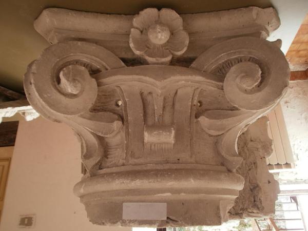 Modello in gesso di semicapitello con elementi di ordini architettonici diversi (volute e fogliame, più un fiore).